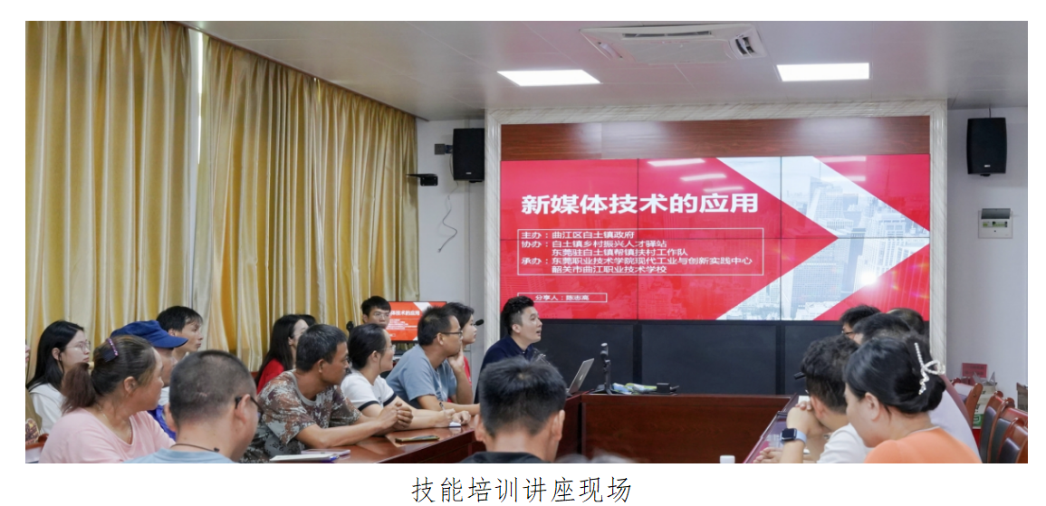 签约仪式后,科技特派员团队展开了一系列的工作调研,并启动了有关科技帮扶工作。学校“粤乡优选”双创团队深入月饼厂房,了解白土月饼制作工艺和特点,并开展为期20天的直播,打造白土品牌,助推白土农特优产品“上行”。“数字媒体”双创团队组织了《新媒体运用实践》讲座,学员来自韶关市曲江区职业技术学校师生及当地农户40余人,培训通过项目化教学,简述如何利用自媒体平台,推广自己的产品,拓宽销售渠道。