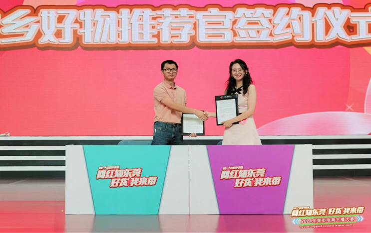 在决赛现场,经过盲盒带货和守擂PK带货两个环节的紧张角逐,我校杜晓君同学以扎实的专业技能和卓越的舞台表现力荣获季军,邓玉婷同学也以良好的表现获得了最具潜力奖,同时两名同学也喜获东莞广播电视台“家乡好物推荐官”的聘书。我校在本次大赛中获得优秀组织单位奖。